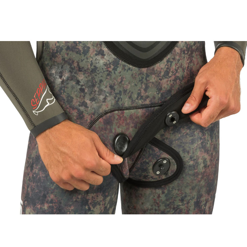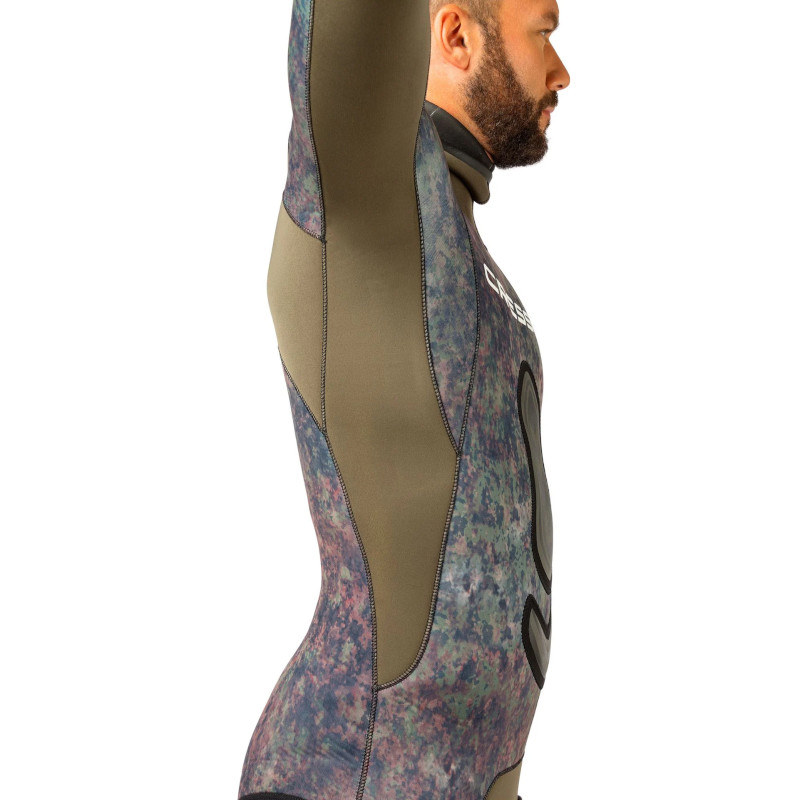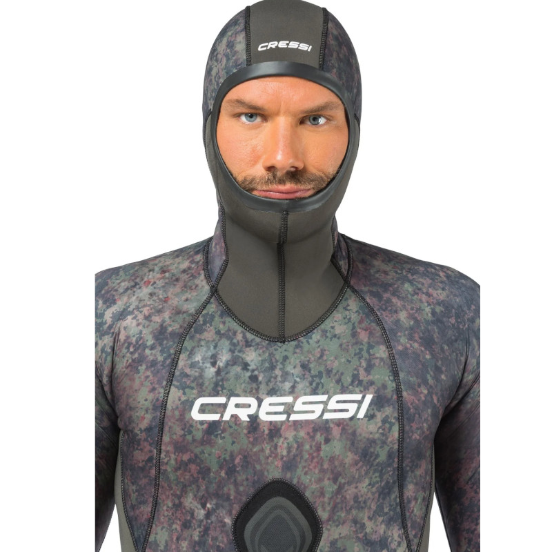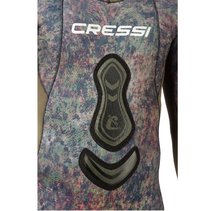 Cressi Seppia je muško dvodijelno lovačko odijelo s ekskluzivnim, računalno dizajniranim kamuflažnim uzorkom stvorenim korištenjem fotografija morskog dna visoke rezolucije. Unutarnja strana ima otvorenu ćeliju, dok je vanjska strana zatvorena (tkanina). Cressi Seppia, dvodijelno lovačko odijelo s ekskluzivnim, računalno dizajniranim kamuflažnim uzorkom stvorenim korištenjem fotografija morskog dna visoke rezolucije. Zeleno-smeđi kamuflažni uzorak otežava plijenu stvaranje jasnih slika, zbunjujući nositelja s pozadinom ili morskim dnom. Vanjska strana odijela izrađena je od 100% ultraspana, koji je vrlo otporan i elastičan. Hlače imaju visoki struk, što omogućuje optimalno širenje prstiju. Jakna ima podstavljeno ojačanje na prsima. Glatke vodootporne brtve na kapuljači, zapešćima i gležnjevima pružaju toplinu. Ojačanje na prsima, koljenima i potkoljenici.