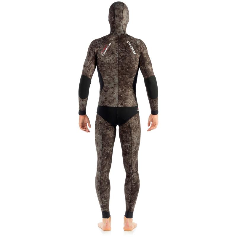 Ronilačko odijelo Cressi Tracina je muško dvodijelno lovačko neoprensko odijelo. Vrhunsko odijelo s neoprenom otvorenih ćelija s unutarnje strane i zatvorenim ćelijama (tkanina) s vanjske strane. Namijenjeno za podvodni ribolov. Odijelo je dostupno u različitim debljinama od 3,5 mm, 5 mm i 7 mm te u kamuflažnoj smeđoj nijansi. Cressi Tracina je izvrstan izbor za sve ljubitelje podvodnog ribolova koji traže izuzetno udobno, toplo i odijelo za skrivanje plijena. Ultramekani neopren otvorenih ćelija s unutarnje strane (vanjska strana i tkanina) i anatomski dizajniran oblik pružaju iznimnu udobnost, dok polimerni sloj na šavovima pruža dodatnu zaštitu odijela (produžuje mu vijek trajanja) i sprječava ulazak vode, što povećava izolacijska svojstva odijela. Odijelo Cressi Tracina može se pohvaliti ojačanjima na prsima, laktovima, koljenima i “Smoothskin” brtvama na kapuljači, struku, zapešćima i gležnjevima. Prednost odijela je i bojanje. Cressi Camouflage Dark Specter Pat je računalno dizajniran uzorak koji sprječava plijen da stvori jasnu sliku, zbog čega se stapamo s okolinom i ne budemo prepoznati.