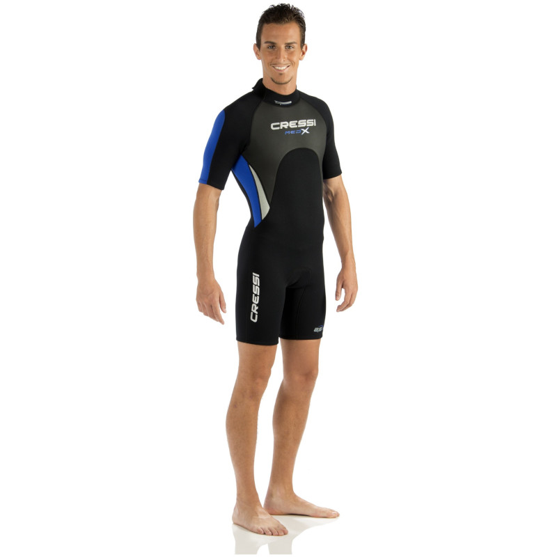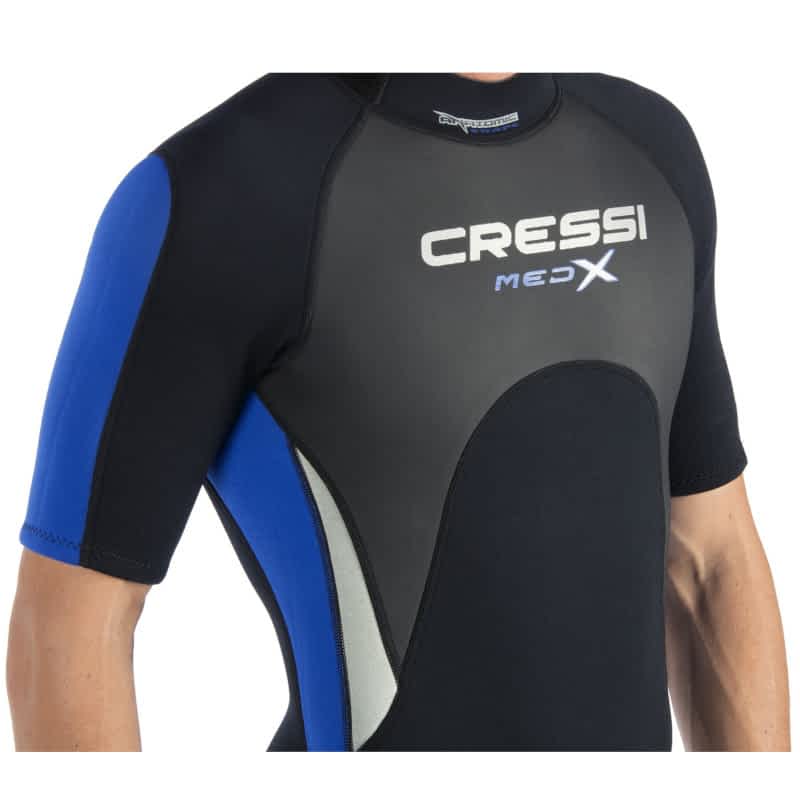 Cressi Med X Shorty je nova verzija najpopularnijeg Cressi jednodijelnog ronilačkog odijela, dizajniranog za vodene sportove i ronjenje u tropskim morima. Odijelo se može pohvaliti moderniziranim krojem i atraktivnim estetskim dizajnom. Riječ je o monokratkom modelu bez kapuljače, s kratkim rukavima i nogavicama, izrađenom od dvoslojnog neoprena debljine 2,5 mm. Područje prsa ojačano je ravnim neoprenom za veću elastičnost i udobnost. Kako bi se smanjio prodor vode, na zapešćima i nogama umetnuti su ravni neoprenski umeci. Cressi Med X Shorty opremljen je izdržljivim YKK patentnim zatvaračem od 8 inča na stražnjoj strani i čičak zatvaračem na vratu, što omogućuje brzo i jednostavno oblačenje te savršeno pristajanje.